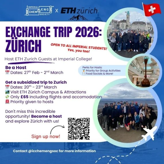This is the ticket for the ETH Zurich Trip in March 2026. Please make sure you have joined ChemEngSoc to purchase this ticket.Each attendee must purchase the ticket for themselves and fill out the corresponding form themselves. For any questions, contact asa124@ic.ac.uk.