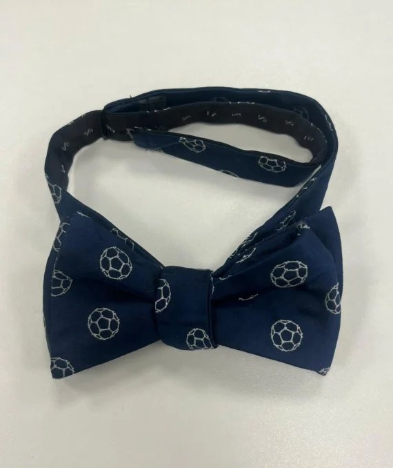 Silk navy bowtie with silver buckyball motif. Adjustable sizing.