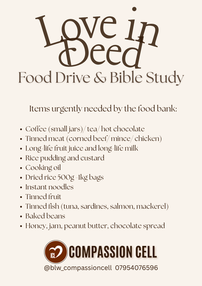 We will be having a food drive and collecting food for Kensignton and Chelsea Food Bank. We will also be having a time of socialising and fellowship at the drop off!
